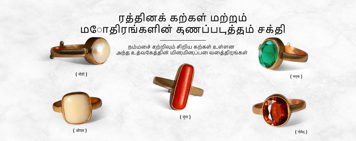 எங்களுடைய ரத்தினக் கற்கள், மோதிரங்கள், ருத்ராட்சங்கள் மற்றும் சிலைகள் அணிபவருக்கு அதிக விருப்பமான முடிவுகளை உறுதி செய்வதற்காக எங்கள் அனுபவம் வாய்ந்த ஜோதிடர்களால் உற்சாகப்படுத்தப்படுகின்றன. வேத ஜோதிடத்தில் கூறப்பட்டுள்ளபடி, ரத்தினக் கற்கள் மற்றும் பிற தயாரிப்புகளின் ஆற்றல், எதிர்மறையான தாக்கங்களை நீக்கி, அதன் வானியல் பண்புகளை மேம்படுத்தி, அணிபவருக்கு/பயனருக்கு நன்மை மற்றும் பாதுகாப்பு அளிக்க வேண்டும்.