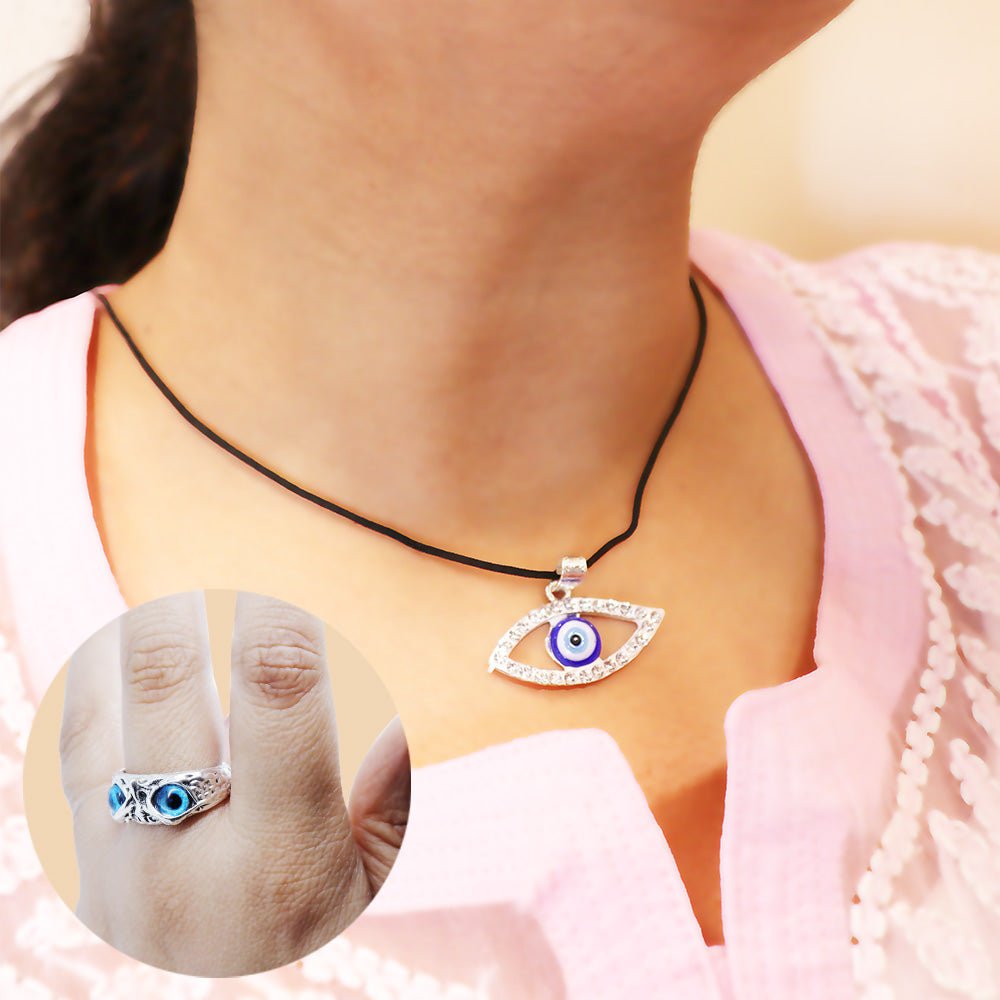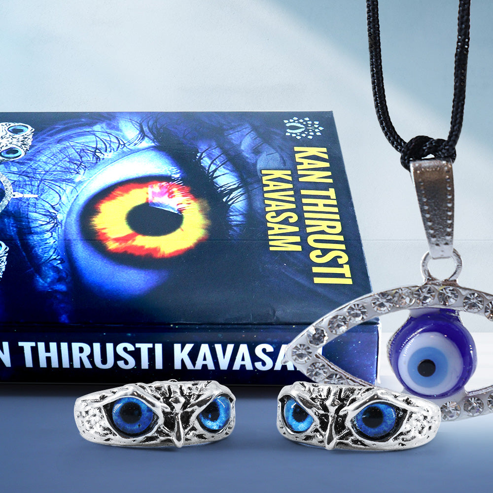 கண் திருஷ்டி கவசம் லாக்கெட் மற்றும் ஆந்தை மோதிரம் அணிபவரைச் சுற்றி ஒரு பாதுகாப்புக் கவசமாக அமைகிறது, இது தீய கண்களிலிருந்து உங்களைப் பாதுகாக்கிறது.