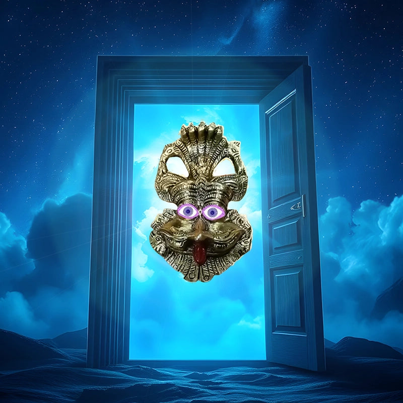 The origin of Keerthimukha comes from a fascinating story in Hindu mythology linked to Lord Shiva. In a moment of divine power, Shiva created a fierce and hungry lion from his third eye to terrify Rahu, a demon who had angered him. The sight of this terrifying creature filled Rahu with fear, and he pleaded with Shiva to show mercy.Shiva, known for his compassion, agreed to spare Rahu but gave the lion a unique task. He commanded the lion to survive by devouring its own body. The lion, obeying Shiva's command, began eating itself, starting with its tail and limbs, until only its face remained. Impressed by its devotion and obedience, Shiva named it Keerthimukha, meaning “glorious face.” Shiva decreed that it would guard the entrances of his temples forever.Since then, Keerthimukha has been a symbol of protection and devotion. It is placed at temple entrances and other sacred places to ward off evil spirits, negative energies, and harmful influences, ensuring that only good intentions are allowed to pass through.